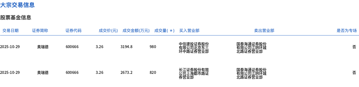 10月29日,奥瑞德大宗交易成交1800万股,成交额5868万元,占当日总成交额的20.78%,成交价3.26元,较市场收盘价3.33元折价2.1%。